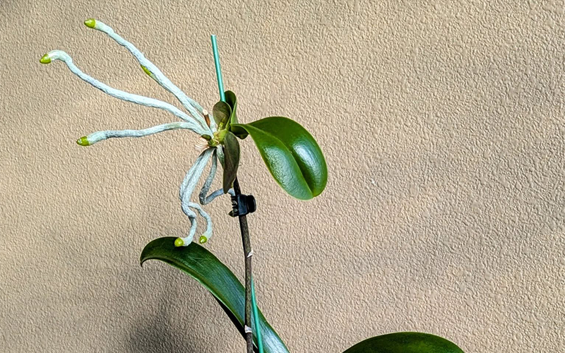 Orhideja lahko raste, vendar ne oblikuje cvetnega stebla. Razlogi so lahko neustrezna svetloba, slaba kakovost substrata, nepravilno zalivanje ali pomanjkanje hranil.